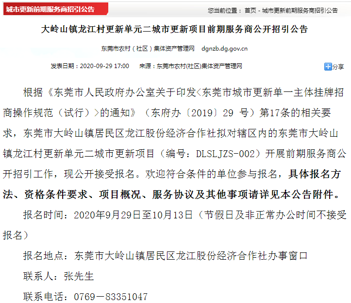 9月29日,大岭山镇居民区龙江股份经济合作社拟对辖区内的东莞市大岭山镇龙江村更新单元三城市更新项目(编号:DLSLJZS-003)开展前期服务商公开招引工作。