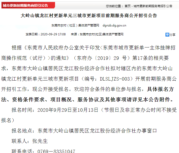 9月30日,大岭山镇颜屋村更新单元【编号:DLSYWZS—001】开始招引前期服务商。