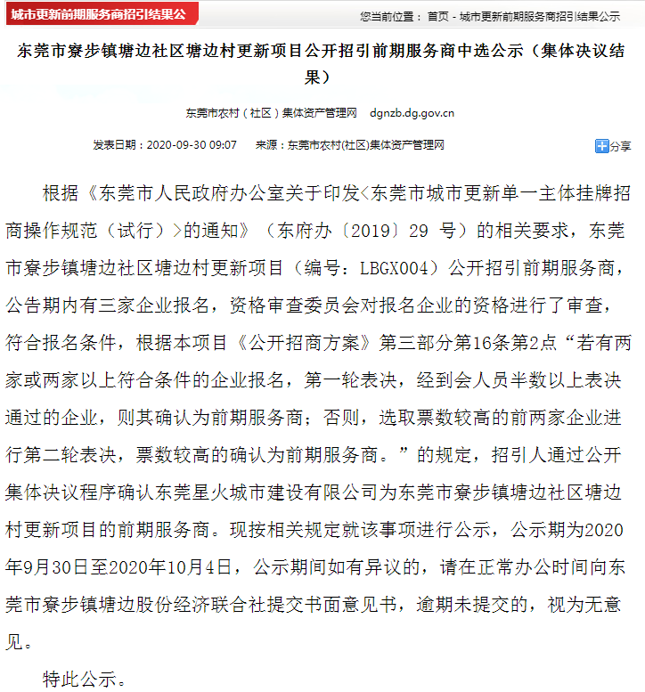 9月30日,寮步镇塘边社区塘边村更新项目(编号:LBGX004)中选结果发布:确认东莞星火城市建设有限公司为前期服务商。